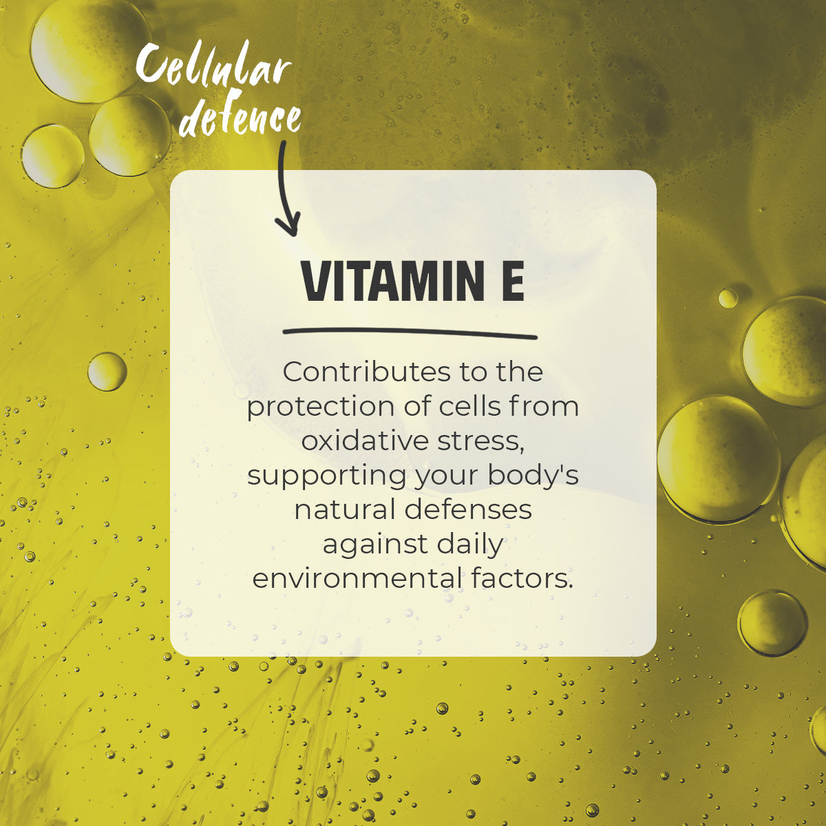 - Cellular Defense. Includes Vitamin E, which contributes to the protection of cells from oxidative stress, supporting your body's natural defenses against daily environmental factors.